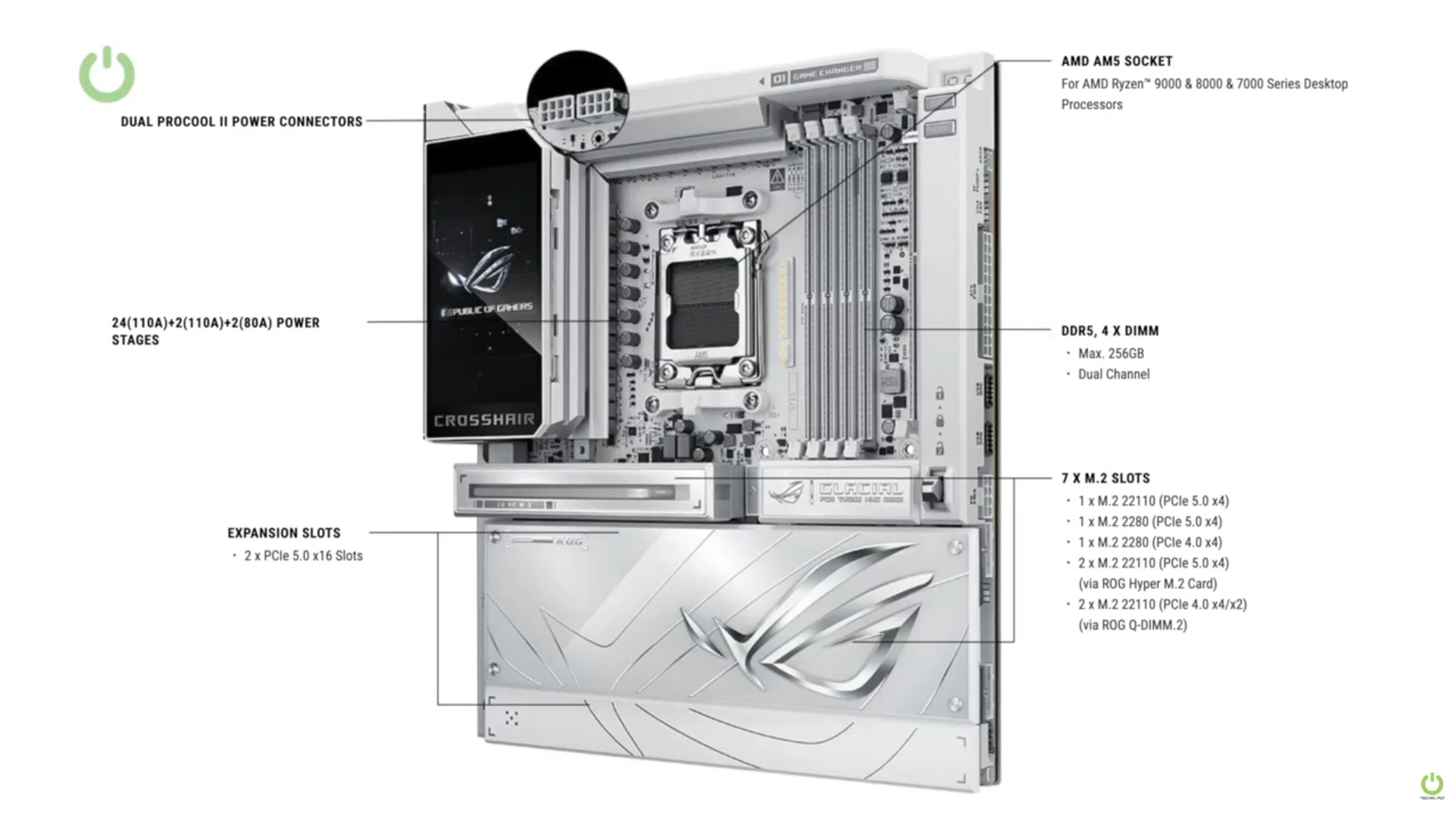 Asus’un anakart tarafındaki vitrini ROG Crosshair X870E Glacial ile başlıyor. Bu model, markanın amiral gemisi anakart yaklaşımını temsil ediyor. Yapay zeka destekli optimizasyon sistemleri, üst seviye güç tasarımı ve yeni nesil hız aşırtma özellikleri kartın merkezinde yer alıyor.