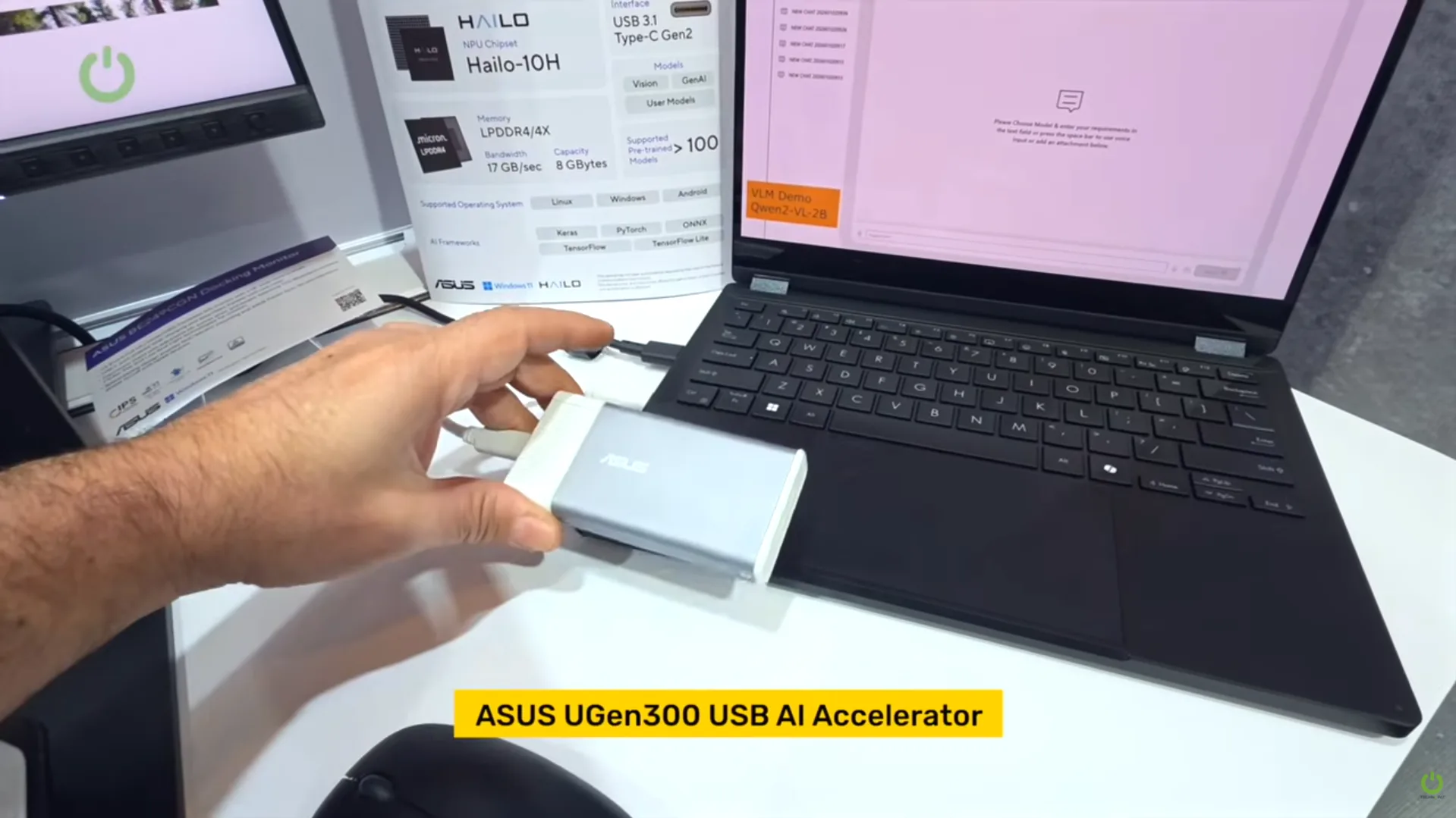 Buna ek olarak Asus UGEN 300 USB AI Accelerator da standın öne çıkan çözümleri arasında yer aldı. USB üzerinden bağlanan bu harici yapay zeka hızlandırıcısı, mevcut masaüstü ve mobil sistemlere ek yapay zeka gücü kazandırıyor.