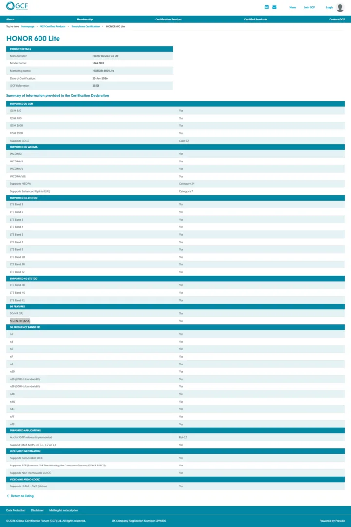 Honor 600 Lite GCF sertifikası aldı