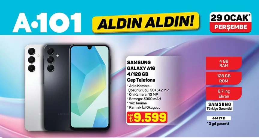 A101’in 29 Ocak tarihli Ekstra ürünleri arasında 4 GB RAM ve 128 GB dahili depolama sunan Galaxy A16 modeli bulunuyor. Akıllı telefonun fiyat etiketi 9.599 TL olarak belirlendi.