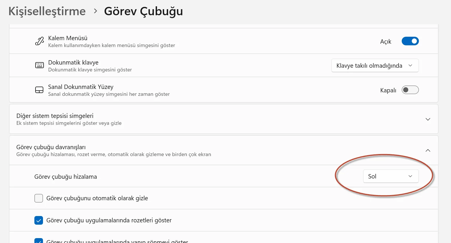 Ayarlar → Kişiselleştirme → Görev Çubuğu → Görev Çubuğu Davranışları