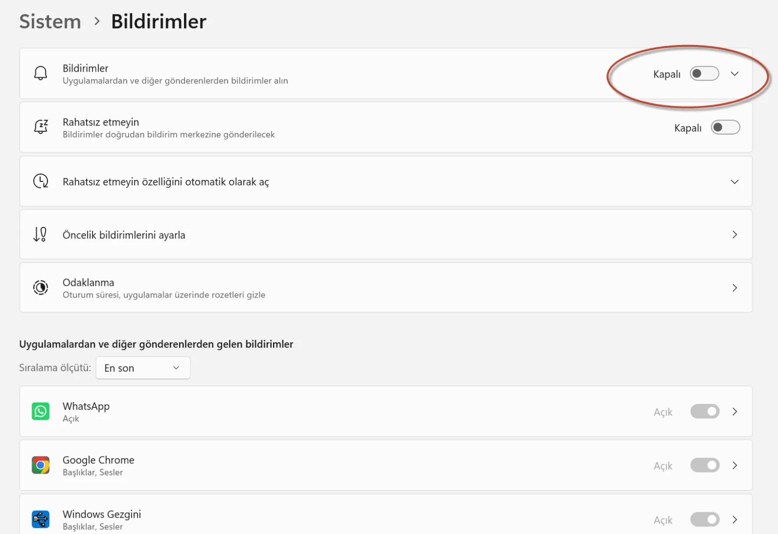 Başlat → Ayarlar → Sistem → Bildirimler