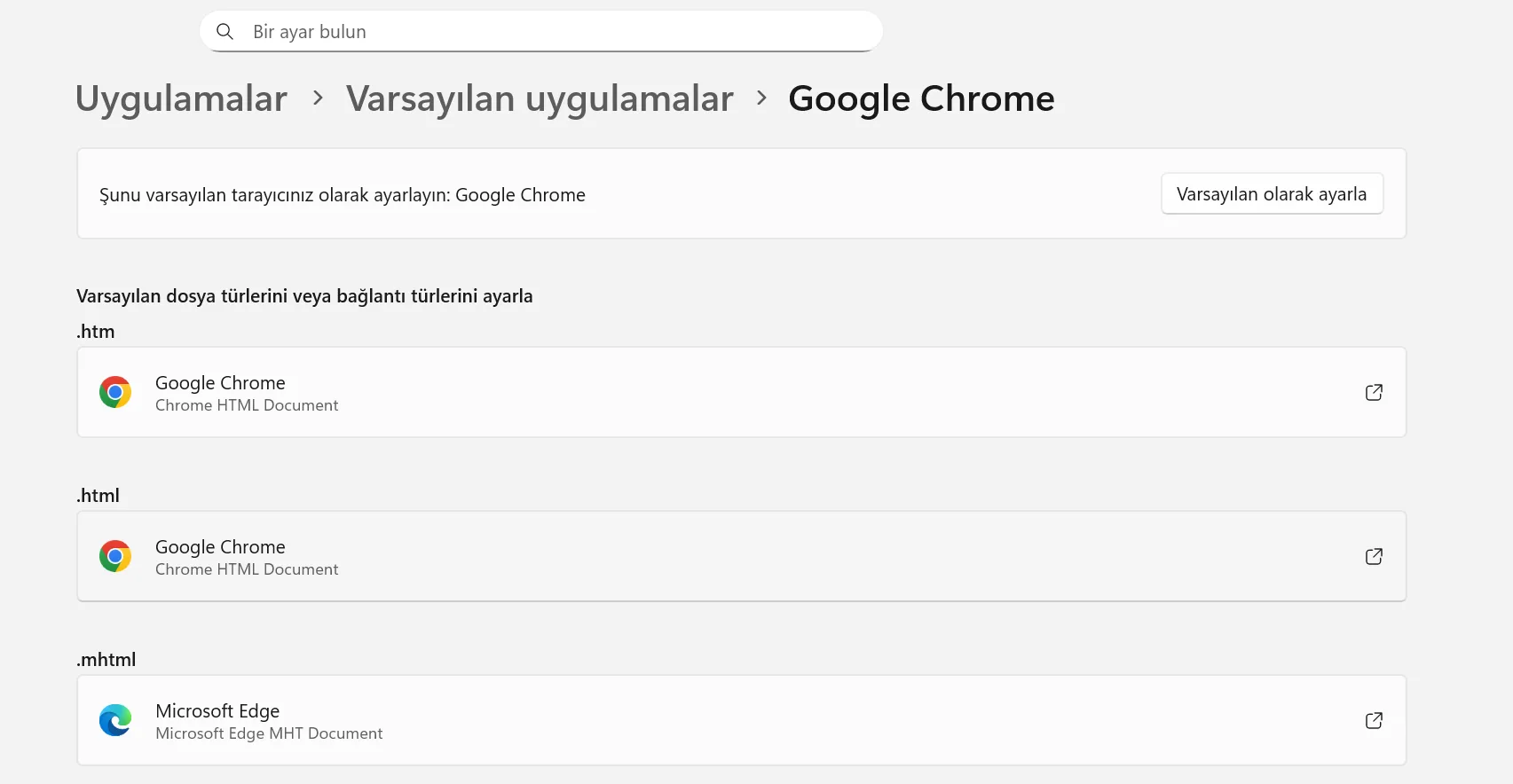 Ayarlar → Uygulamalar → Varsayılan Uygulamalar