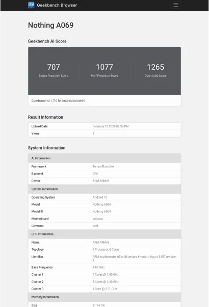 Geekbench AI testinde cihaz; tek hassasiyet kategorisinde 707, yüksek hassasiyette 1077 ve quantized testinde 1265 puan aldı. Bu sonuçlar yalnızca yapay zeka test sonuçlarını gösteriyor. Ekran, kamera, batarya kapasitesi ve şarj hızı gibi diğer teknik detaylara dair bilgi vermiyor.
