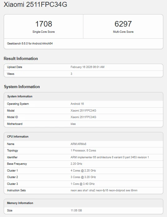 POCO X8 Pro, 2511FPC34G model numarasıyla Geekbench veri tabanında göründü. Akıllı telefon yapılan tek çekirdekli testlerden 1708 ve çok çekirdekli testlerden ise 6297 puan almayı başardı. Bununla birlikte bazı özellikleri dolaylı yoldan da olsa belli oldu.