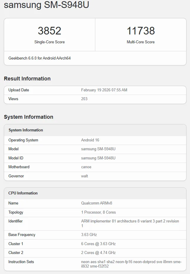 Galaxy S26 Ultra, Geekbench 6 testlerinde 3.852 tek çekirdek ve 11.738 çok çekirdek puanı aldı. Samsung’un Galaxy modellerine özel optimize ettiği Snapdragon işlemci bu sonuçta rol oynuyor. Snapdragon 8 Elite Gen 5 For Galaxy isimli yonga seti standart sürüme kıyasla daha yüksek frekans değerleri sunuyor diyebiliriz.