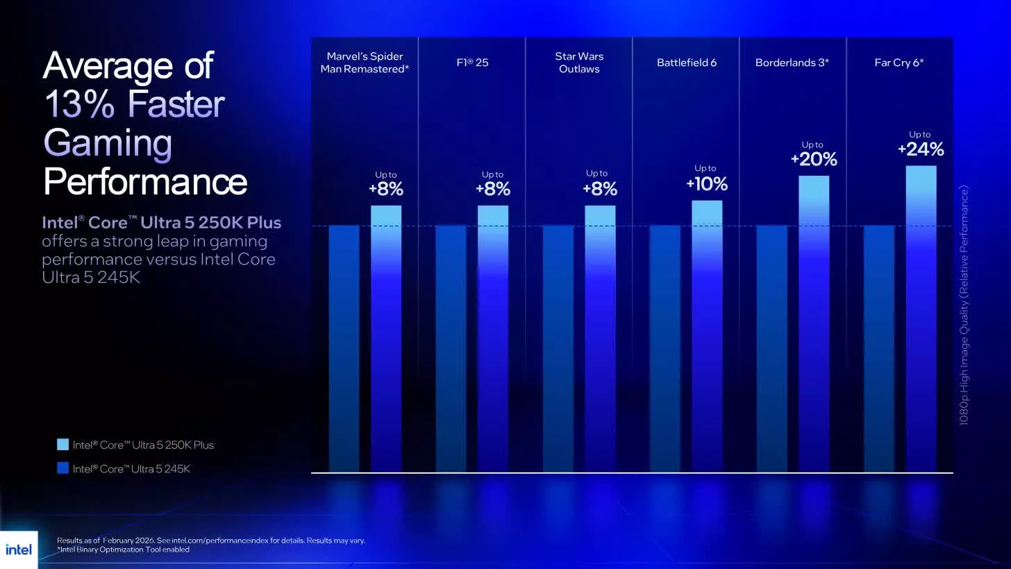 Şirketin oyun performansı tarafındaki en önemli iddialarından biri de yeni Intel Binary Optimization Tool üzerine kurulu. Bu araç, geliştiricilerin oyun kodunda değişiklik yapmasına gerek kalmadan belirli oyunlarda performansı artırmak için hazırlanan bir ikili çeviri katmanı olarak tanımlanıyor.