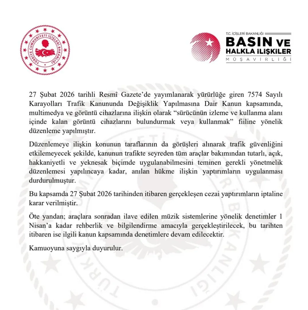 Bakanlığın açıklamasında 27 Şubat 2026 tarihli Resmi Gazete’de yayımlanarak yürürlüğe giren 7574 sayılı Karayolları Trafik Kanununda Değişiklik Yapılmasına Dair Kanun kapsamında multimedya ve görüntü cihazlarına ilişkin olarak sürücünün izleme ve kullanma alanı içinde kalan görüntü cihazlarını bulundurmak veya kullanmak fiiline yönelik düzenleme yapıldığı hatırlatıldı.