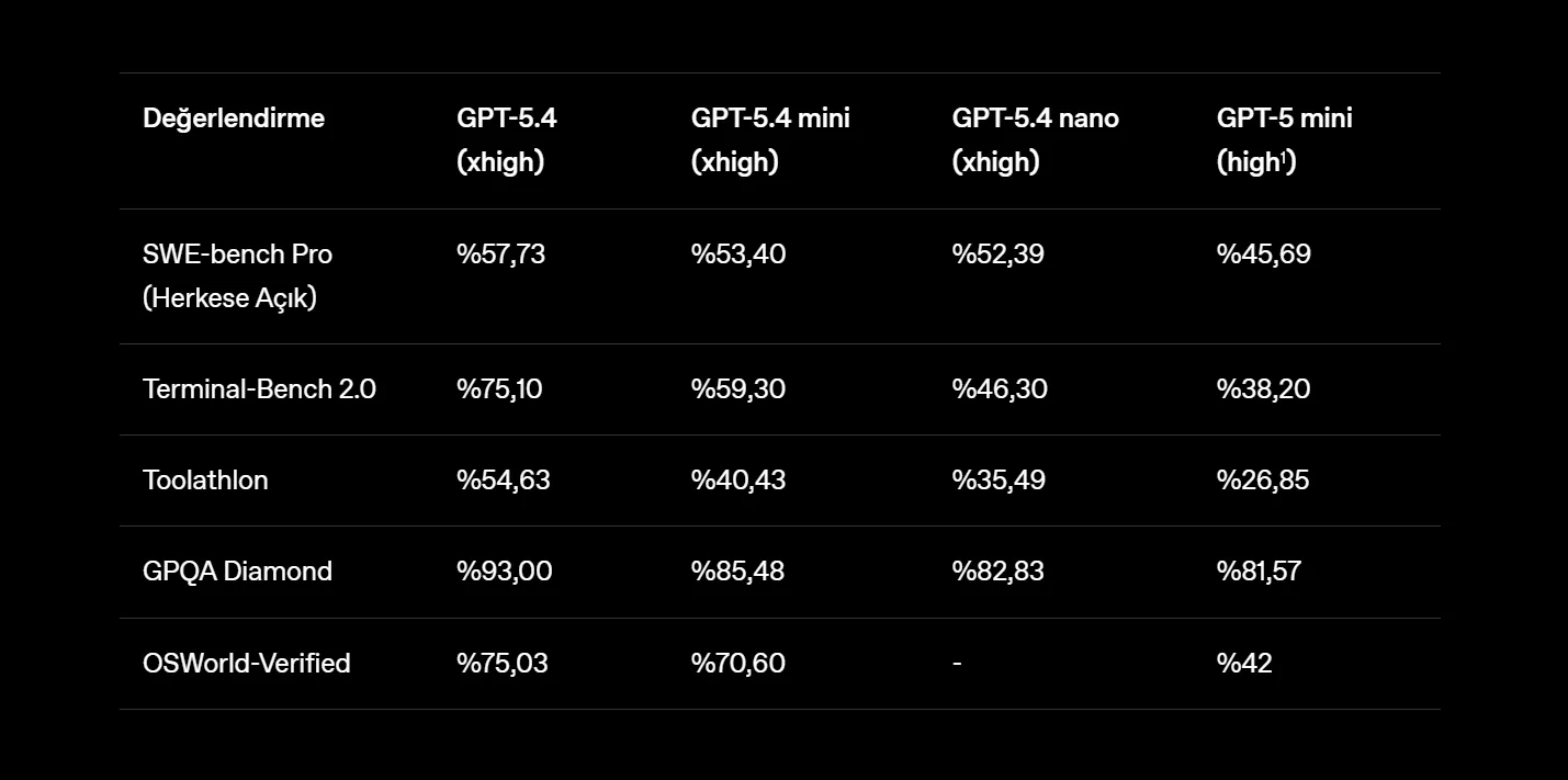 OpenAI, GPT-5.4 mini ve GPT-5.4 nano modellerini kullanıma açtı. GPT-5.4 mini bugün API, Codex ve ChatGPT tarafında erişilebiliyor. GPT-5.4 nano ise yalnızca API’de yer alıyor. Şirket GPT-5.4 mini için 1 milyon girdi token’ı başına 0,75 dolar, 1 milyon çıktı token’ı başına 4,50 dolar fiyat açıkladı. GPT-5.4 nano tarafında bu ücretler sırasıyla 0,20 dolar ve 1,25 dolar olarak duyuruldu.