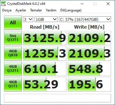 Oyun testlerine geçmeden önce kısa bir SSD testi gerçekleştirdik. İşte Force MP510 NVMe SSD’miz ile aldığımız sonuç: