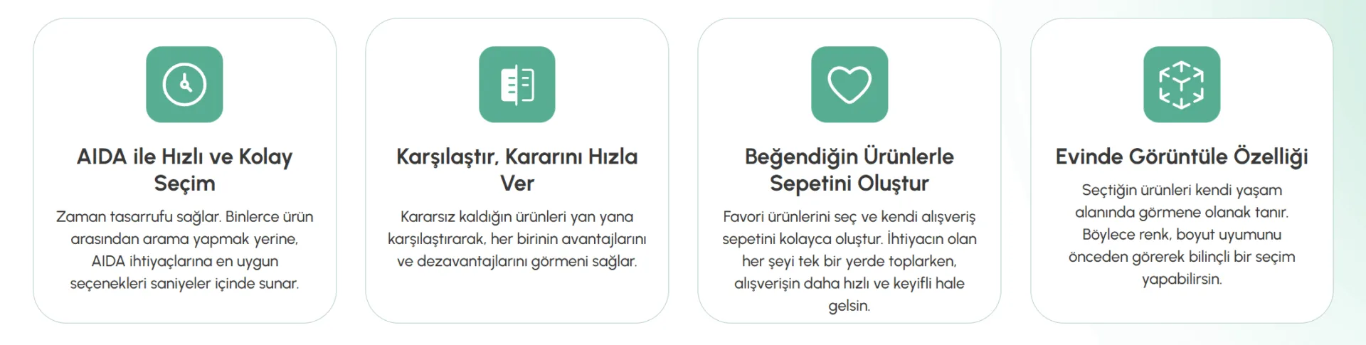 AIDA bu sorular doğrultusunda ürün özelliklerini, kullanım alanlarını ve uygun alternatifleri aktararak yönlendirme yapıyor. Bu yapı özellikle kararsız kalınan alışveriş anlarında süreci daha anlaşılır hale getiriyor.