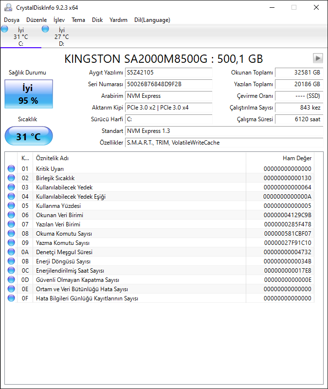 Bilgisayarımda şu anda "Kingston 500GB A2000 NVMe M.2 SSD" kullanıyorum. Bu SSD'yi 4 sene üzeridir kullanıyorum ve bir sıkıntı yaşamadım. Önerilen programlarla kontrol ettiğimde sağlığının %95 olduğu gösteriliyor.