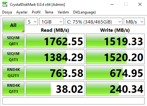 300FPS aldığım bir oyunda bile %1 ve %0.1 FPS değerlerim sürekli olarak 10-30 civarlarına düşüyor ve takılmalar yapıyor. Diskimde bir sorun olduğunu sanmıyorum, test sonuçlarını aşağıya bırakacağım. Daha önce 3 ay kadar MPT ile overclocklu şekilde kullandım ekran kartını, o mu bir zarar verdi bilmiyorum. Tek merak ettiğim şey, bu sorun ekran kartından kaynaklanıyor olabilir mi? Defalarca kez format attım, farklı farklı sürücüler denedim ancak düzelmedi. Eğer ekran kartından olduğuna emin olursam direkt olarak değiştireceğim ekran kartını. Defalarca kez konu açtım ancak cevap bulamadım, cidden canımı çok sıkıyor bu durum.