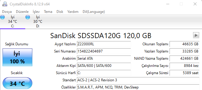 Merhaba, yaklaşık 10 senedir SanDisk bir SSD kullanıyorum ve sağlık durumu %100. normal mi?