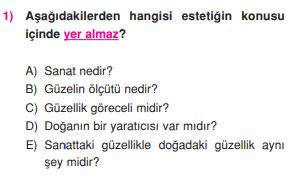 Sanat ile estetik zaten iç içe. Güzelliğin ölçütü de estetikte sayılabilir çok açıkça. Aynı şekilde C şıkkı da. Neresini anlamadığını bilmiyorum ama E şıkkı da estetiğin konusu olabilir. Zira estetik, sanatla, güzellikle ve zevkle ilgilenen felsefe dalıdır. Cevap açıkça D şıkkı.