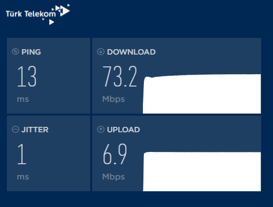 • PC kablo ile bağlantı download 73 Mbps kusur, upload 7 Mbps.