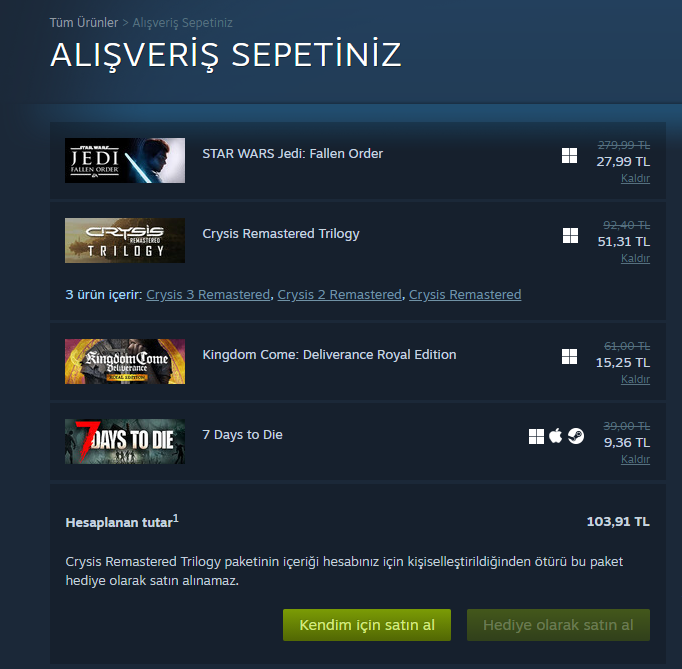 Steam'de ortalama 100 liram vardı ve böyle bir sepet dizdim. Sepetin içinde neyi çıkarıp ne ekleyebilirim? Öneriniz var mı, şimdiden teşekkürler.