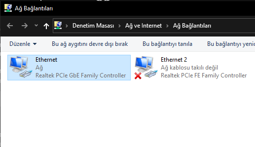 Ethernet girişiyle alakalı olabilir problem. Sağ alttaki internet ikonuna tıklayın ve açılan Ayarlar sekmesinde "Bağdaştırıcı seçeneklerini değiştir" seçeneğine tıklayın. Orada mevcut bağlı ethernetin altında GbE mi yazıyor FE mi yazıyor bakın. Mesela benim 2 ethernet girişim var.