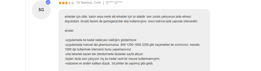 öyle bir kaide yok, viper v2 lerin orta tekerleği çöp 8 ayda dönmemeye başlıyor. Dünya kadar şikayet okuturum sana razer ile ilgili, sabaha kadarda tartisabilirim. Razer olduğu veya logitech olduğu en iyi olduğu anlamına gelmiyor. Bu sektörde razerdan iyi bin tane marka var. Razer toplama bir marka sadece dış plastiğini kendisi üretiyor, içinde kullandığı sensör 3950, mcusunu nordic üretiyor, switchleri omron. razera kadar pulsar var ninjutso var, çok daha iyi fiyat performans ürünleri var. Adam burada 1000 liralık ürün istemiş. 1000 liraya razerin bu fiyatta 120 gramlık kablolu takozları var onlarda işe yaramaz.