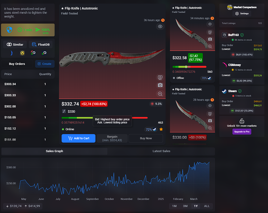 ★ Flip Knife | Autotronic sitesinden yıllık aylık 3 yıllık getirilerini kontrol etmenizi öneririm biraz daha araştırırsanız yıllık getirisi daha fazla olan skinler bulabilirsiniz daha iyi bir kar yakalamak istiyorsanız şu anda trade up skinleri veya kırmızı nadirlikteki drop pooldan kalkan kasaların skinlerine bakabilirsiniz.