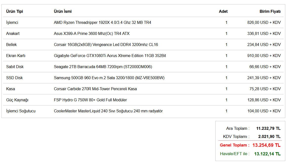 Eğer 13000 TL bütçeniz varsa Ryzen Threadripper 1920X(1950X de olur) ve Gigabyte X399 Aorus tercih edebilirsiniz. 1080 TI önerim de MSI 1080 TI Lightning Z veya 1080 TI Sea Hawk Ek X almanız olacaktır.