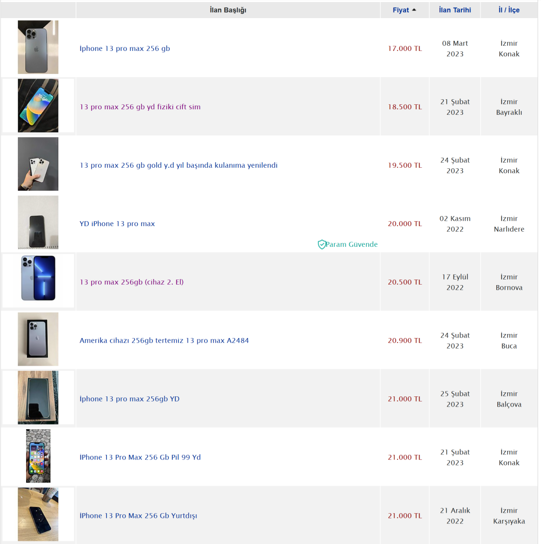 13 Pro Max (256 GB) ikinci el fiyatları böyle gibi (IMEI kayıtsız), 20k bütçe ayırıyorum 13 pm için.
