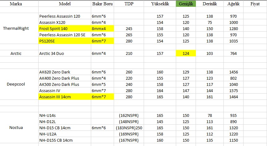 Kasalarımız oldukça komplike parçalardan oluşuyor. Örneğin M2 soğutucu kullanmak istediğimde arctic duo 34 genişliğine sahip bir air cooler şart. Belki 1-2 cm daha geniş olabilir. Fazlası m2 soğutucu kullanmaya müsade etmiyor. M2 soğutucumda da çok memnunum. Şurada bir konu açmıştım. Aynı anda hepsinden tatmin olmak biraz zor gibi. Noctua için kesinlikle aynı şeyi düşünüyorum. Almadığıma pişman olmuştum ama çok büyük kasamda istediğim her parçaya olanak sağlamıyor. Geçen gün kısa bir çalışma yaptım. Air Cooler'ları listeledim. TDP ve boyut bazında inceledim. Faydası olabilir.