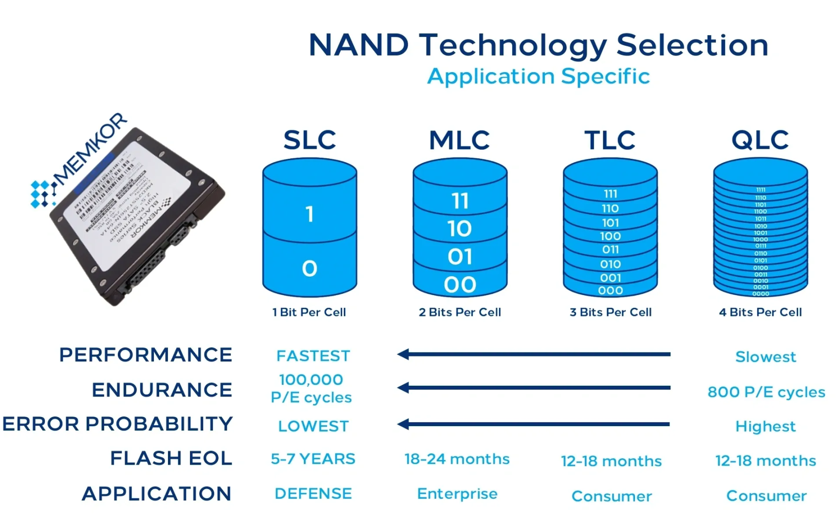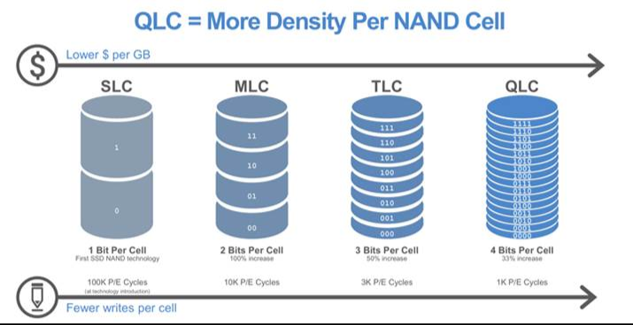 Şu fotoğrafta olduğu gibi hocam ne kadar çok hücre bölümüne sahip olursa okadar kalitesi düşüyor binevi. Standart olarak zaten çoğu SSD TLC, MLC veya SLC nadiren görüyoruz. QLC ise ucuz fiyatlarda sık çıkıyor karşımıza.