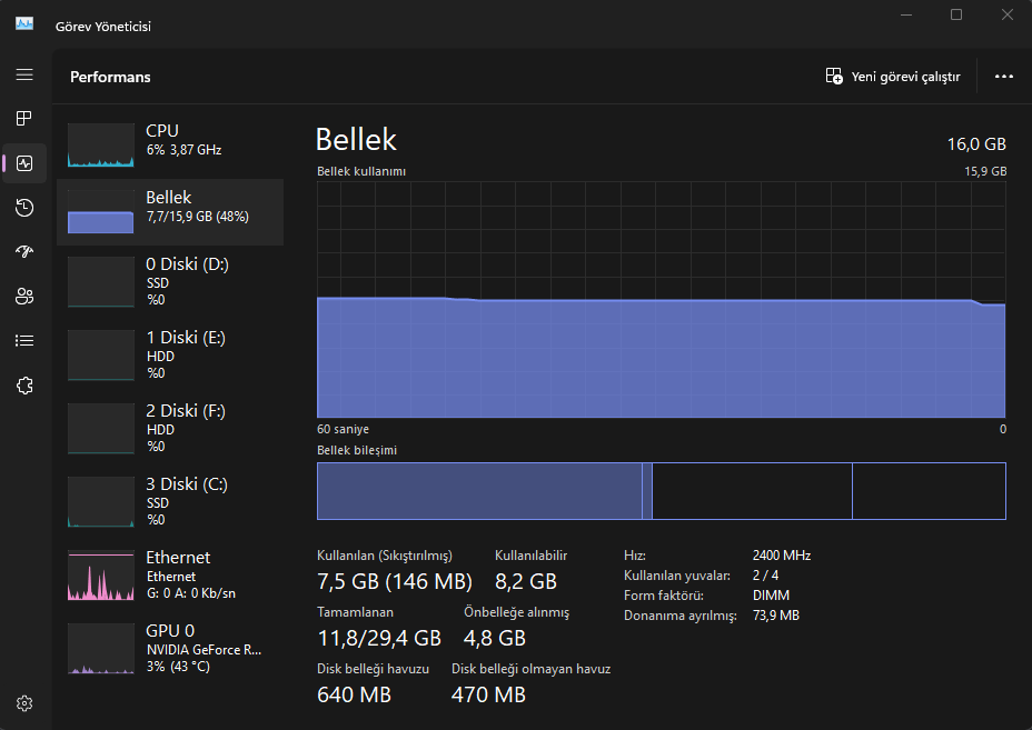 Merhaba, sorunum bu şekilde. 16 GB RAM takılı ancak 8.2 kullanılabilir olarak görünüyor