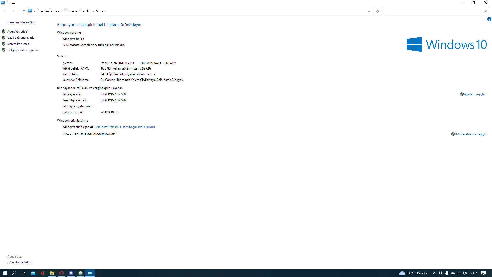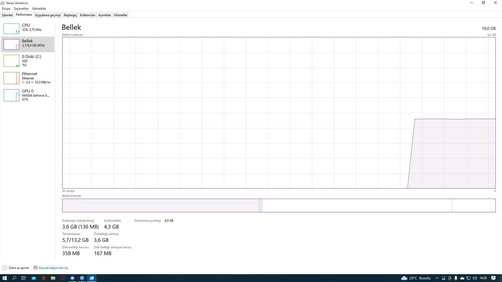 Dediğim gibi, sistemde 16 GB RAM var ama 8 GB'ı bir şekilde kullanılıyor.