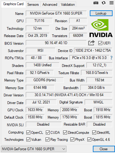 Ekran kartı modeli: MSI GTX 1660 Super Ventus XS OC.