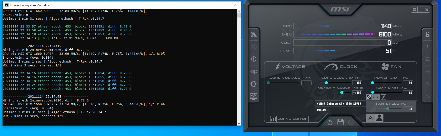 RTX2060 ile de mining yapıyorum bugün denk geldi bu kartı aldım (MSI AERO ITX) bu 2060'tan fazla MH veriyor. OC'yi buraya kadar hata almadan yükselttim daha da yükselir mi bilmiyorum. Sizin 1660S'ler kaç MH alıyor rica etsem paylaşır mısınız?