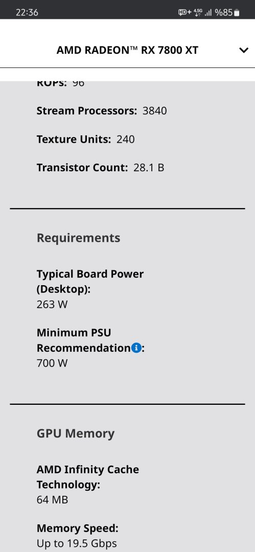TechPowerUp'tan bakıyorum. Daha garanti oluyor. Ki zaten minimum 600W istiyor 7800XT. Adamlar en kötü ihtimali düşünüyor. Ve hız aşırtma yapılmadığına tam performanslı çalışmayacağını ilk defa duydum. Bir de diyorsun ki bilip bilmeden yorum yapma. Neremle gülsem şaştım kaldım.