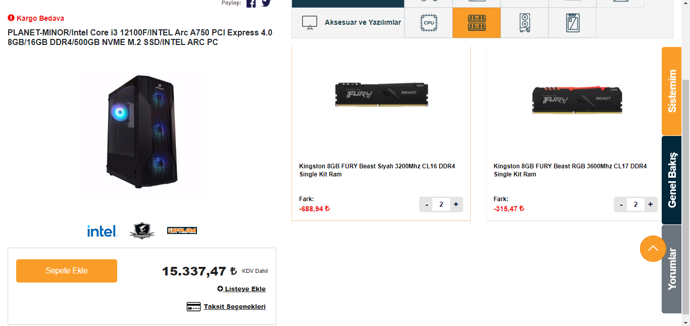 20.000TL monitör dahil sistem önerisi