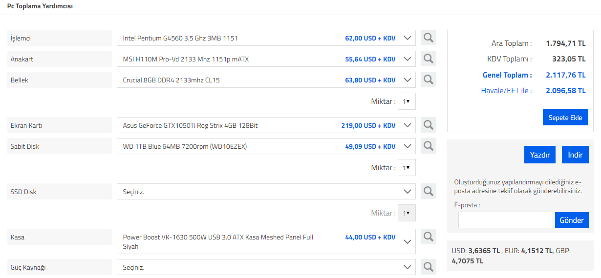 Merhaba. Bir arkadaşım bilgisayar toplamak istiyormuş, ben de size danışayım en iyisi dedim. 2000-2100 TL bütçesi var en fazla. Mümkünse ekran kartı 1050 olacak şekilde bir sistem istiyor. Yardımlarınız için teşekkürler. (Başka ekran kartı veya bileşen önerecek olursanız belirtin lütfen. Fiyata kasa dahil.)