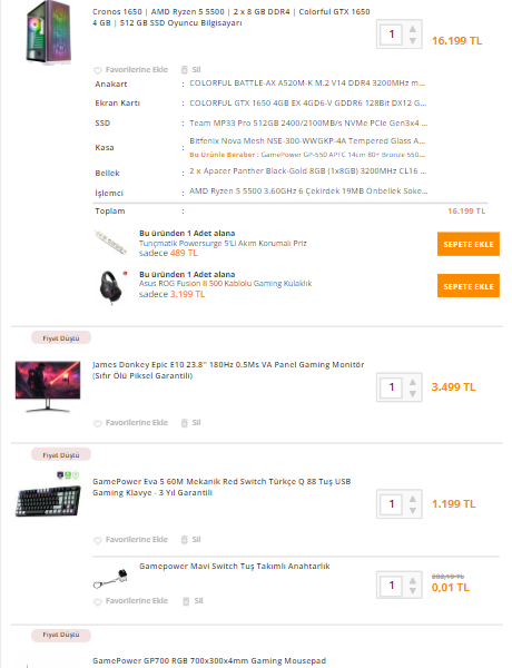 Ben kendime böyle bir sistem kurdum sizce iyi mi ya da öneriniz var mı? parçalardan biri sıkıntılı mı? önerileri alırım, toplam 21k bütçe maksimum. Altta mousepad de var ama tam gözükmemiş, o 459 TL.