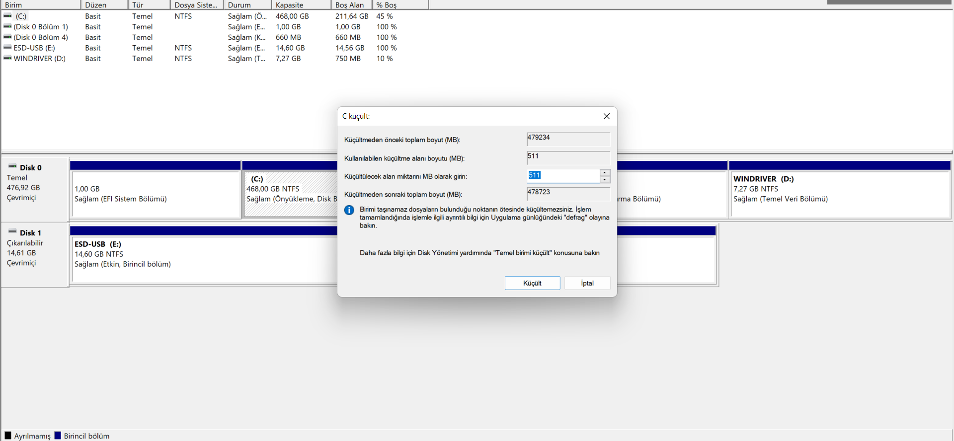 Herkese merhaba, arkadaşlar başlıkta da belirttiğim gibi 512 GB'lik SSD de 215 GB boş alan olmasına rağmen diski bölmek istediğimde maximum bölebileceğim alan 512 MB gösteriyor. Bunun çözümü nedir?