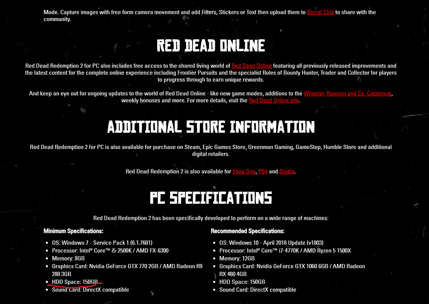 Hocam oyun dediğiniz gibi 119GB yer kaplıyor. Demin Steam'de başka bir oyun üzerinden denedim, kabul etmedi. Rockstar Launcher belki farklı çalışıyordur ama sanmıyorum. Çünkü attığım resimde göreceğiniz üzere minimum sistem gereksinimlerinde 150GB istemişler. Üstte de belirttiğim gibi bu geri kalan 30GB alan tahminimce ekran görüntüleri (screen shot) ve ileride gelme ihtimali olan güncellemeler için.