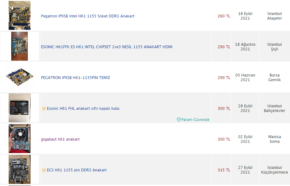 2-) Anakart: H61 (300 TL)