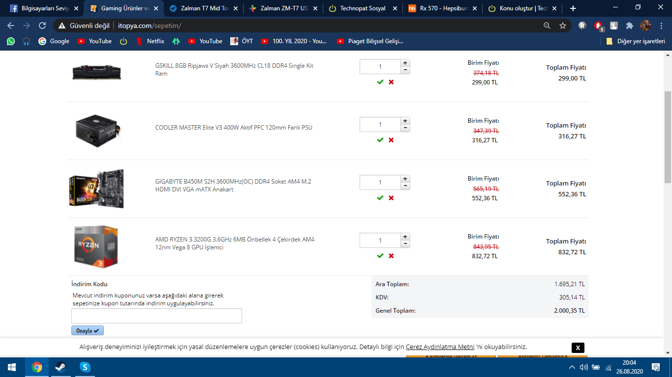Merhabalar, ofis işleri için ve ileride yükseltme şansı olduğu için bu tip bir sistemin işimi göreceğini düşündüm. Şu an ekran kartı almayacağım için APU seçmek zorundayım. Ekran kartıyla daha ucuza gelen sistem yok. i3 10100 düşündüm ancak anakartları aşırı pahalı geldi. i3 9100 yerine de bunu alarak en azından CS:GO, Dota gibi oyunları oynayabilirim diye düşündüm. Elimde SSD HDD bolca var. Ekran görüntüsüne ek olarak Zalman ZM-T7 kasa alacağım. En azından kalite olarak diğer RGB'lilerden iyi olduğunu düşünüyorum. Aynı şekilde güç kaynağı olarak da Cooler Master dışında bu fiyat bandında kaliteli markaların ürünlerini göremedim. Alternatif kaliteli markalardan 80+ önerileriniz var mıdır? Varsa önerileriniz nelerdir? Teşekkürler...