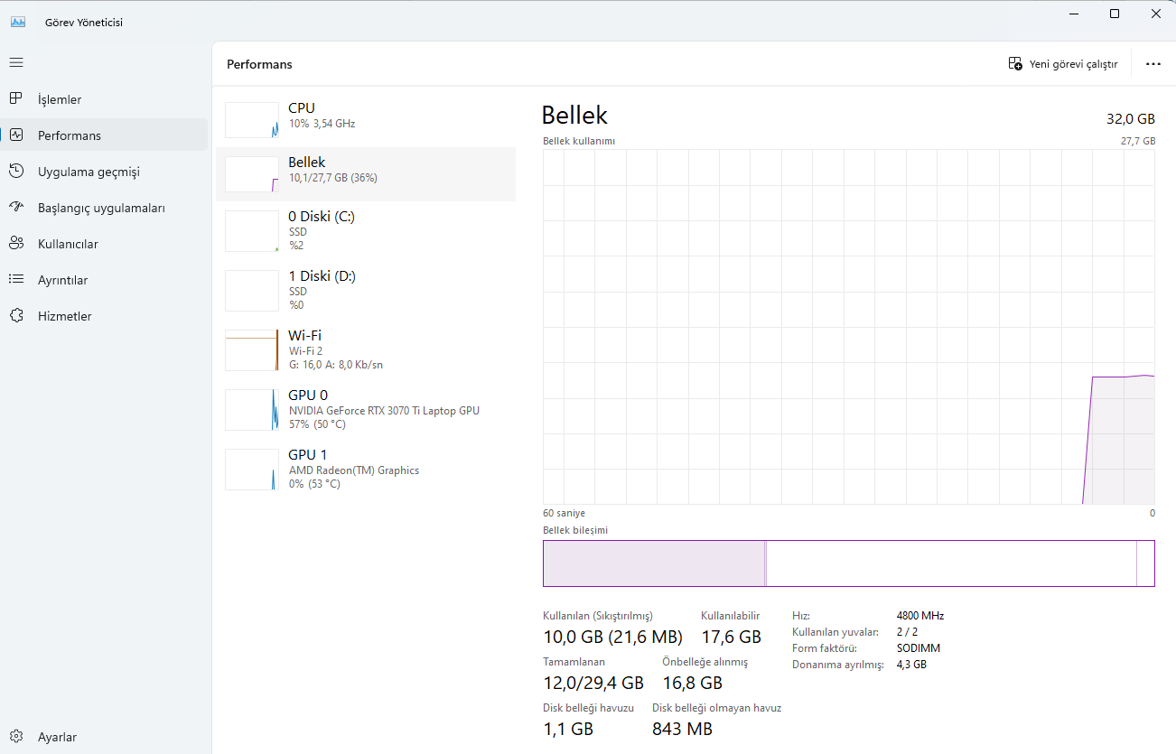 RAM'lerin yerini değiştirdim anlık 21 GB kullanılabilir gözüküyor. Ancak görev yöneticisinde toplam kullanım 1 GB falan. Ona rağmen %15'lerde geziyor 21 GB olsa yüzde 15'i olmaz gibi hala kullanmıyor sanırım.