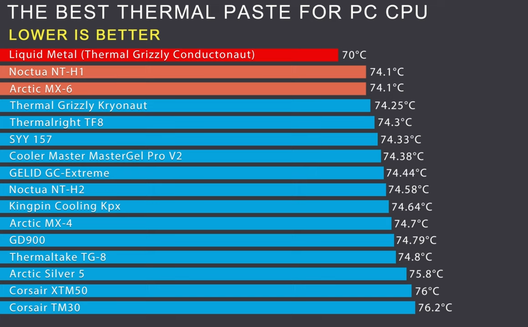 Bu kağıt üstü değerlere bakıp yorum yapmanızı tavsite etmiyorum. Pratik bilgi olmadan, bizzat deneyimlemeden pek doğru sonuca ulaşamazsınız. Mesela listede orta sıralarda bulunan kingpin kpx adlı macunu hiçbir macuna değişmem, maalesef ülkemizde bulmak çok zor. Yurt dışında arkadaşa denk geldikçe getirtiyorum, evde 4-5 tüp yarısı kullanılmış kpx var. 4-5 sistemde denedim, hiçbir zaman üzmedi, Kryonaut'tan bile çok daha iyi bir macun yaptığım testlere göre.