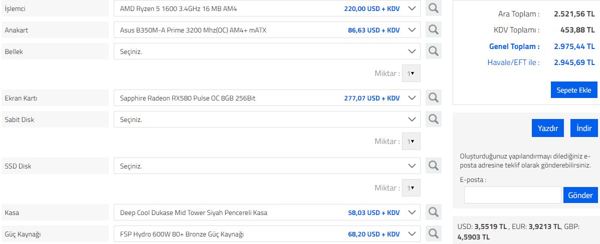 Yakın zamanda bir bilgisayar toplayacağım. Bütce aralığım 2500-3000 TL. Şu an elimde önceki bilgisayarımdan kalma RAM'lerim (8 GB), SSD'm ve 1 TB HDD'm var. Bunlar dahil olmaksızın RX 480 8 GB veya 580 8 GB ekran kartlı bir sistem düşünüyorum. Fakat hangi anakartı ve hangi işlemciyi ve kasayı almalıyım?