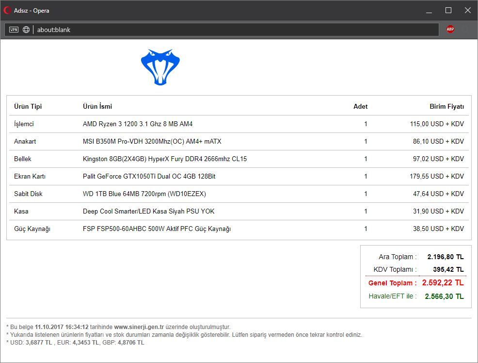 İşlemci | AMD Ryzen 3 1200 3.1 Ghz 8 MB AM4 | 1 | 115,00 USD + KDV |