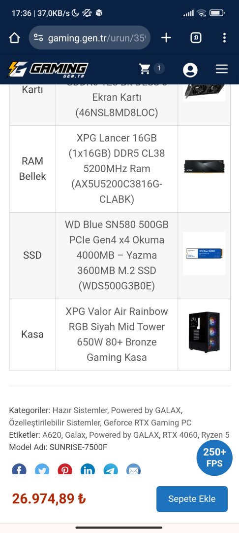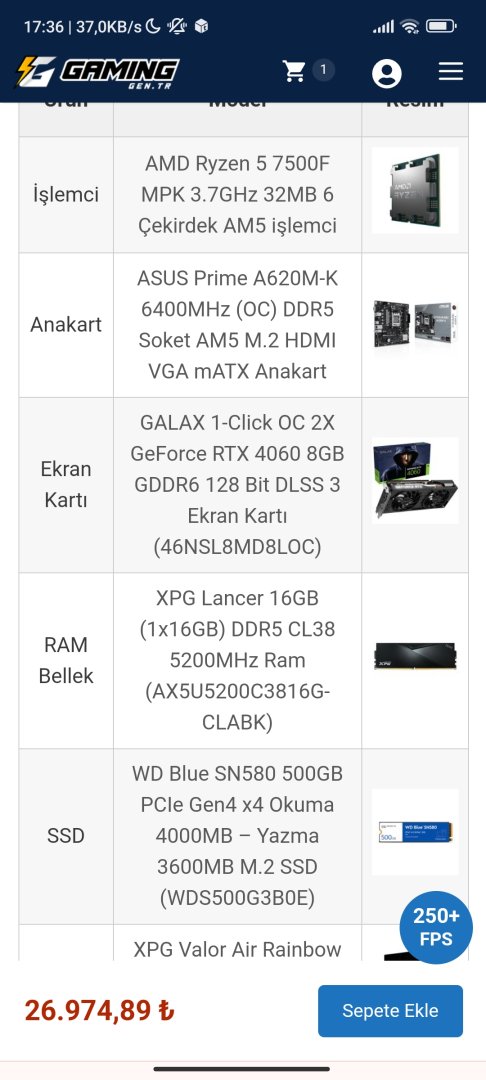SUNRISE-7500F / AMD Ryzen 5 7500F MPK / GALAX 1-Click OC 2X GeForce RTX 4060 8GB / 16GB RAM / 500GB M.2 SSD Gaming Bilgisayar