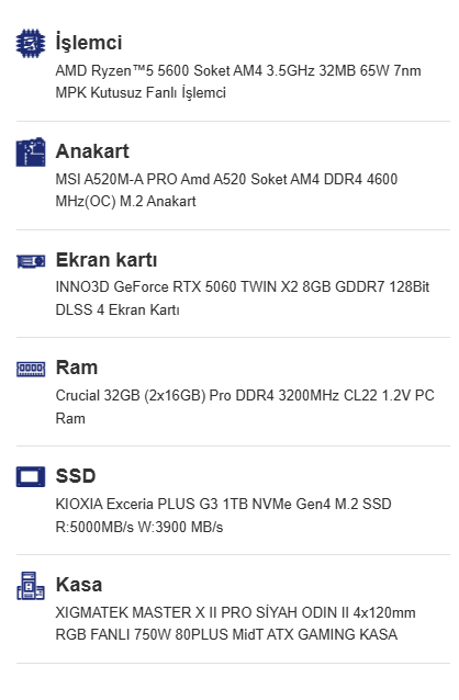 BURAK YORUK-GG2 / AMD Ryzen 5 7500F MPK / ASUS DUAL GeForce RTX 5060 OC 8GB / 16GB RAM / 500GB M.2 SSD Sistem Tavsiyesi