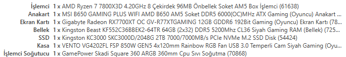 Aldığınız veya alacağınız donanımlar uyumsuz demeyelim de birbiriyle alakasız. O ekran kartı ile 2K çözünürlükte iyi bir deneyim yaşayamazsınız keza 64 GB bir RAM hele ki 5200MHz ve CL 36 değerinde bir RAM çok yanlış keza 7800x3D sizin sisteme fazla, ya ikinci el uygun alacaksınız veya alternatif farklı bir ürün seçeceksiniz, misal 9700X gibi ve buna karşın o sıvı soğutma markasını duymadım ve muhtelen önermem, onun yerine farklı ve daha iyi alternatifler var.
