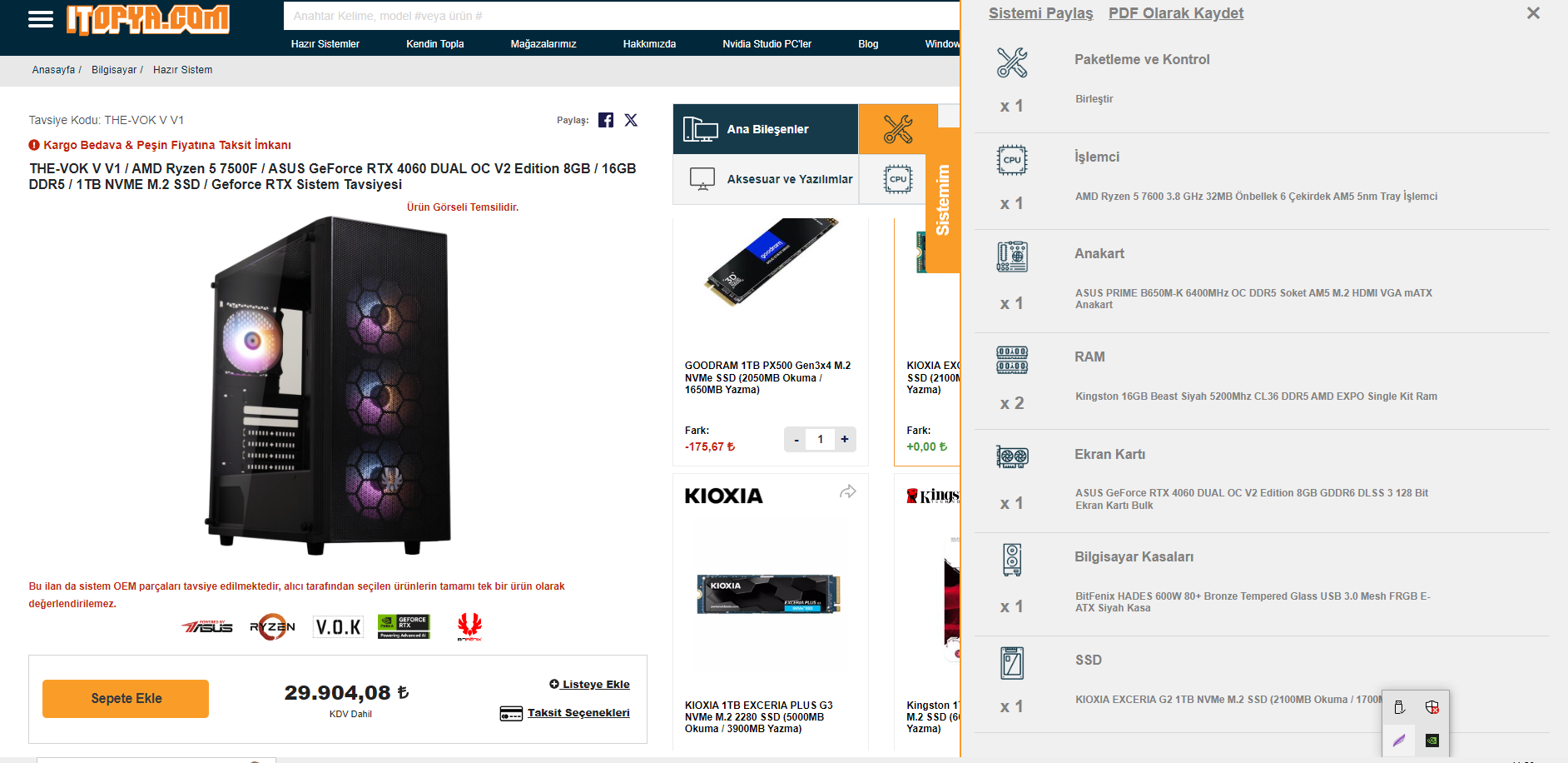 SSD: Kingston 1TB NV2 NVMe M.2 SSD 3500 MB okuma/2100mb yazma ~> Kingston 1TB NC3 NVMe M.2 SSD 6000 MB okuma/4000mb yazma.