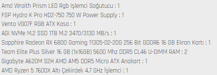 RTX 4060 Ti 16 GB ekran kartı düşündüm fakat performansta aşırı düşüş olmayacaksa farklı bir model de olabilir. Mümkün olduğu kadar F/P sistem olsun istiyorum.