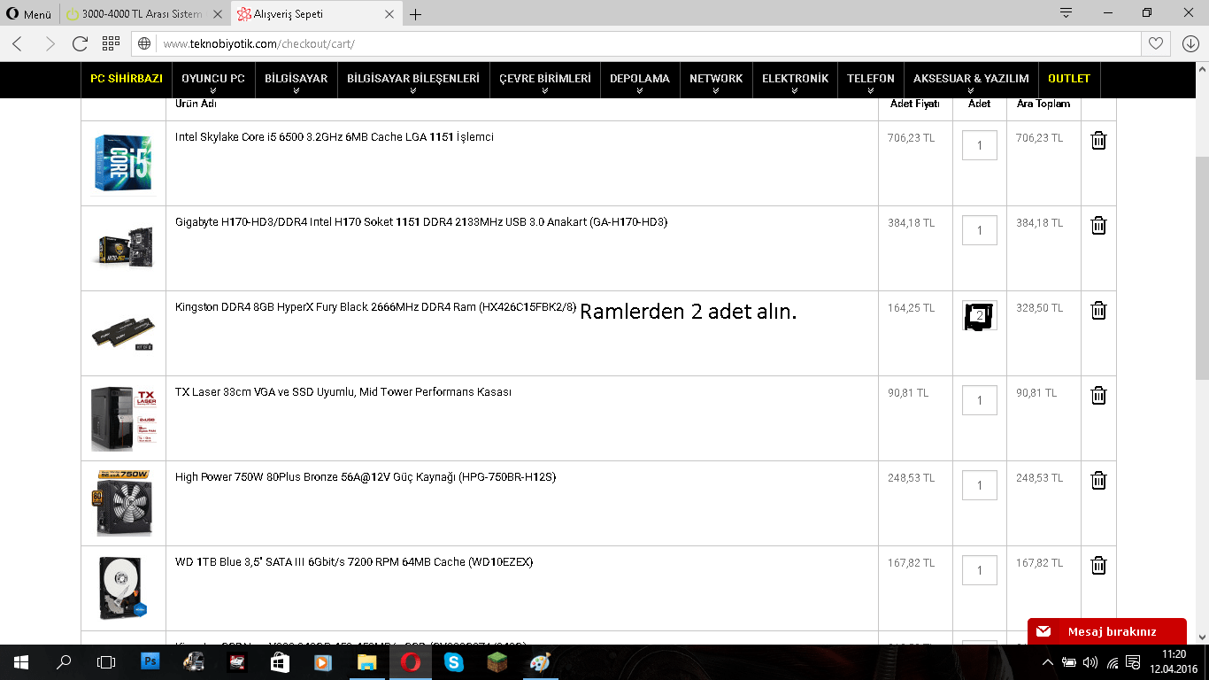 Toplam 3820 TL yukarıdaki fiyatlara KDV dahil değil. Monitör dahil uygun fiyatlı bu şekilde olur 4000 TL ye tamamlamak istersen İ5 6600K alabilirsin ama soğutucu da alman gerekir. Soğutucu almak istersen de monitörden kısabilir 5 ms 23" bir model alabilirsin 500 TL civarlarında.